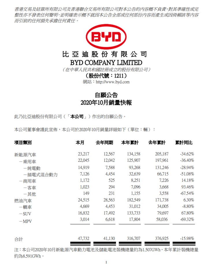 11月4日,比亚迪股份在港交所披露10月销量快报。比亚迪10月汽车销量47732辆,去年同期41130辆;新能源汽车销量23217辆,去年同期为12567辆。