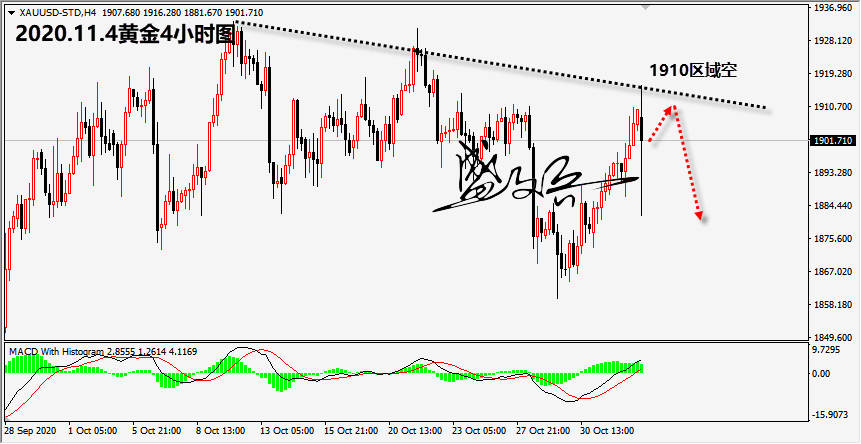 多空剧震,反弹遇阻,承压走跌,下看破位!昨日盘金价一路慢涨上扬至1910美元上方,最终价守稳。今早间直接开高再探1916美元,在此承压后掉头转跌,截止到目前触低1881美元,早盘时段便创出35美金之多的波幅,美国大选下的走势紧张而激烈。 正如昨日我所预期的那样,一方面来看现任总统胜任的概率越来越大,另