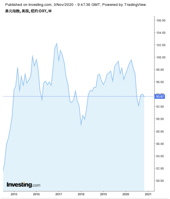 华尔街围绕美国大选后局势对美股具体影响的争论很多,但对于美元而言,一种观点占据着主流地位:无论是拜登逆袭,还是特朗普连任,美元的大趋势都是向下。 随着股票的下跌,美元在10月份恢复了一定的涨幅,但美元指数年内迄今仍然下跌了近3%。 特朗普四年任期内的美元走势 在特朗普过去近四年的任