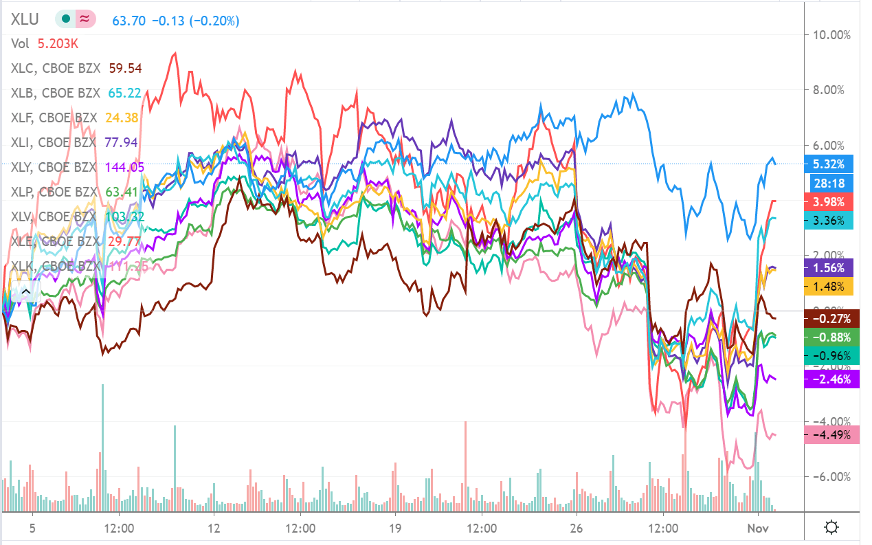 在一连串的竞选活动中,标普500TF-DR(Y)在上个月下跌了2.5%。纳斯达克100指数TF(QQQ)下跌3%,但罗素2000指数上涨2.2%。 在标准普尔500指数细分的板块中,只有公用事业板块(XLU)在上个月上涨5%。通信服务板块(XLC)下跌0.3%,材料板块(XL)下跌0.7%。 在跌幅最大的板块中,信息技术板块(X