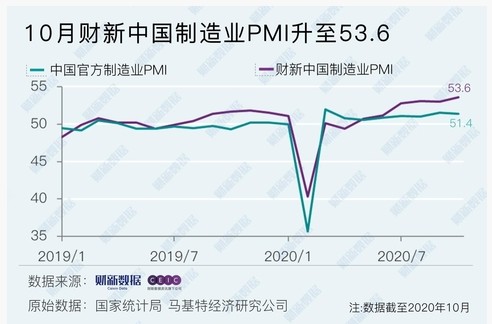 随着国内外经济持续回暖,11月2日公布的10月财新中国制造业采购经理人指数(I)录得53.6,较9月回升0.6个百分点,为2011年2月以来最高值,显示制造业景气状况改善明显。 这一走势与统计局制造业I并不一致。国家统计局公布的10月制造业I录得51.4,较9月微降0.1个百分点。 随着卫生事件影响逐步消退,