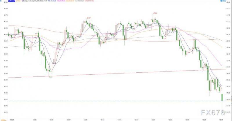 周一(11月02日)亚盘时间段,美原油再度大跌,日线级别连续4日下行,创5月内新低,现报34.56美元/桶,跌幅约3.6%,因市场预测特朗普或将连任美国总统,这将导致美国经济刺激规模很可能缩小,不利于美国经济的复苏,利空原油。新冠感染人数激增,法国和德国宣布新的封锁措施,加剧了市场的担忧情绪。原油价格大幅下滑
