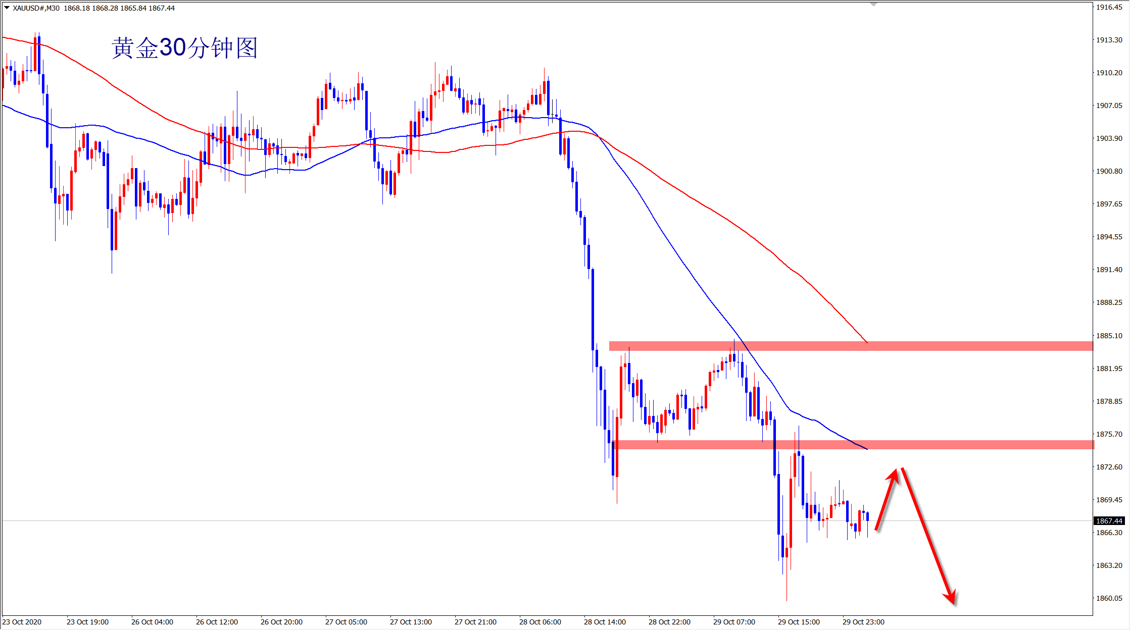 黄金 欧元区公布的三季度GD初值数据,尽管数据好于市场的预期,但是经济增持还是呈现负增长,数据对黄金的影响相对较校晚盘重点关注美国经济数据以及美股走势对于黄金的影响。 黄金白盘正如预期笔者预期,金价在1878位置承压后产生一波下跌只1866一线。只要参与这波空头行情这,至少有10美元的空