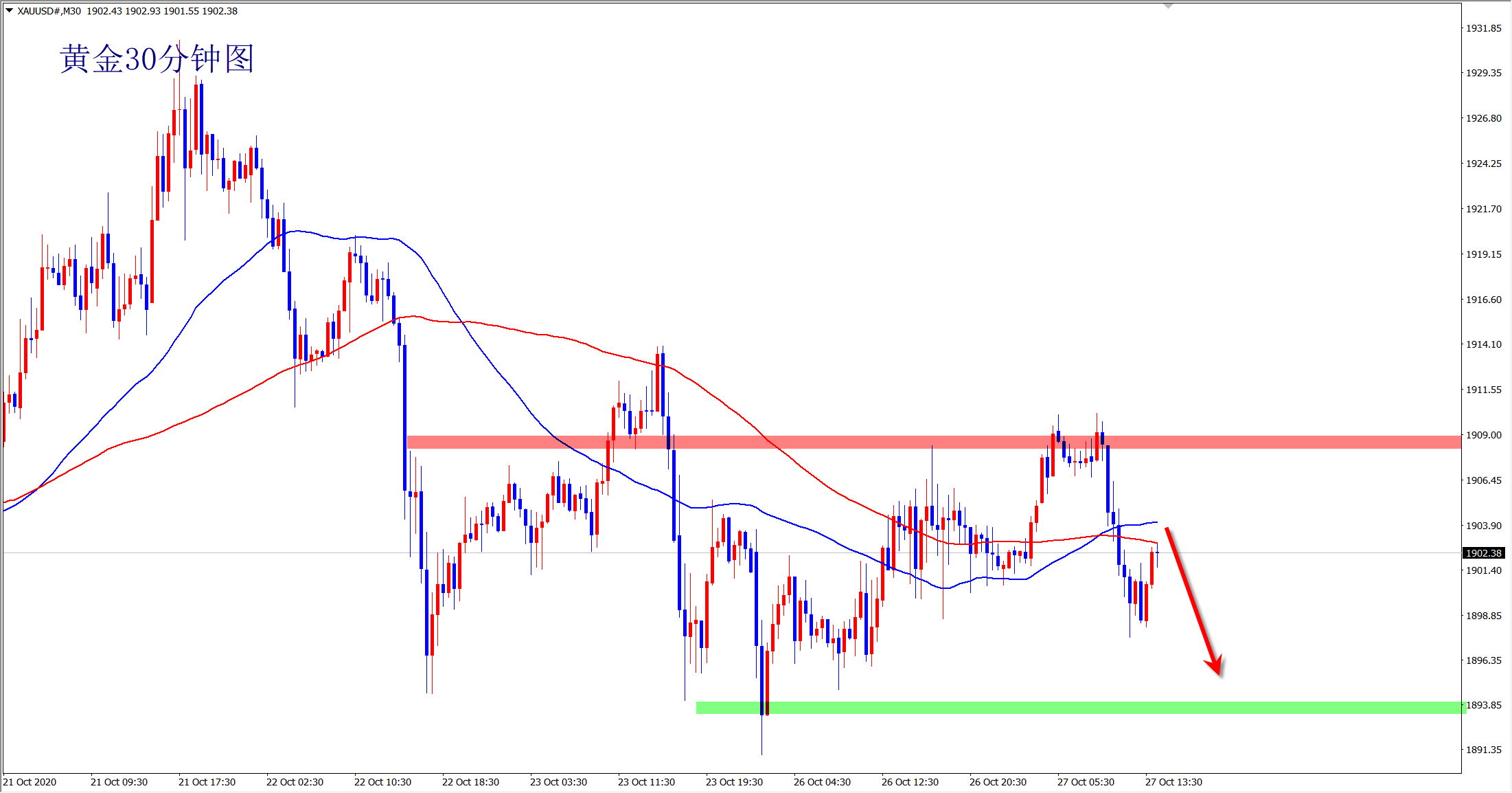 黄金再现过山车走势,欧盘小双顶后下挫10美金,美盘关注1910阻力,如果反弹不能再次新高,黄金转空下跌概率大! 黄金现在依然是震荡行情,多空延续性极差。欧盘行情急跌后再1898位置获得支撑,不排除行情再次拉升至1910的可能,但是如果再次上涨不能突破1910阻力,则必然转为再次下跌走势!多空反复的走势,守