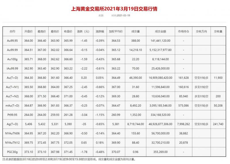 周五(3月19日)上海黄金交易所收盘上涨0.05%至366.40元/克;白银T+D收盘下跌0.65%至5390元/千克。金价收盘微幅上涨,主要因美联储宽松的政策给金价带来支撑,但美债收益率持续攀升又给金价沉重的压力。此外,欧洲疫情担忧升温,这支持美元也不利于金价。 上海黄金交易所2021年3月19日交易行情,黄金T+D成交量46.