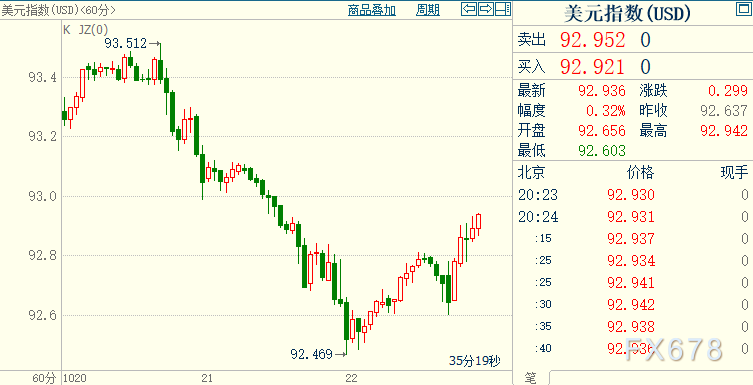 周四(10月22日)欧市盘中,全球市场情绪偏谨慎,欧美股市震荡回升,欧洲股市主要股指早盘一度扩大跌幅,随后扳回全部跌幅;美国股指期货震荡上涨;汇市方面,美元反弹,回到93关口附近,欧元、英镑等G10货币遭遇抛压,欧元最低跌至1.1815;英镑触及1.3082,现货黄金也遭遇了抛售,昨天一度冲至1930上方。分析认为,美