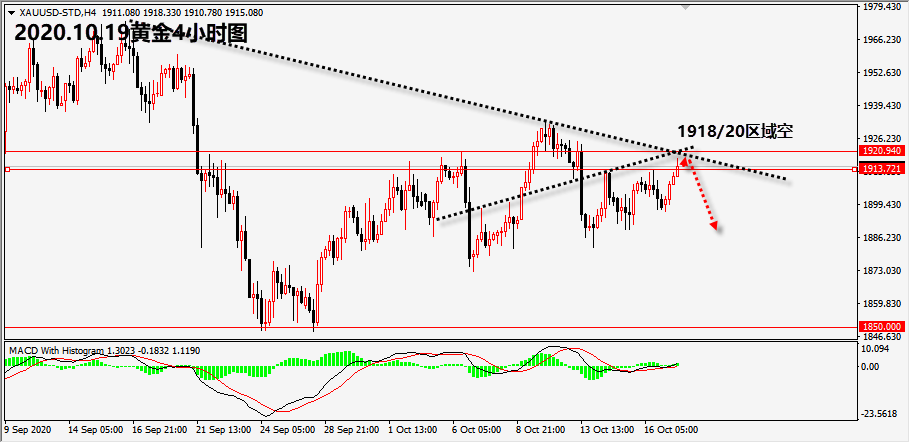 周一(10月19日)欧市盘中,现货黄金维持涨势,早前最高曾触及1918.46美元/盎司,距离日内最低水平大涨超过20美元。由于市场风险情绪回暖,美元遭遇抛售,金价趁机反弹。 针对金价走势,消息面来看,尽管美国有关新一轮财政刺激能没有结果,但是众议院议长佩洛西周日仍表示对在大选前达成刺激计划感到乐观。而据