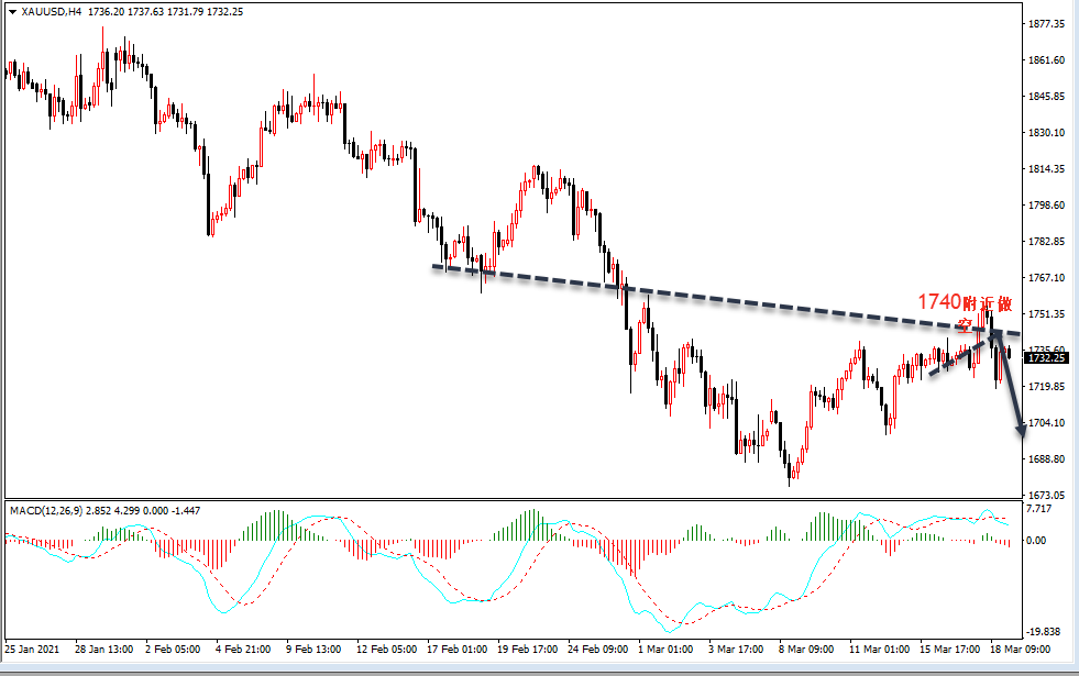 10年美债收益率再创14个月新高,通胀再度高起,市场开始再度担忧通胀,受此消息面的影响,昨日股市,大宗,原油,黄金等品种都迎来了一定幅度的破位大跌走势,目前技术面通胀再度成为市场的主题 昨日黄金收盘为一根中小阴线,技术面黄金出现了冲高回落,再度跌回到1740附近,目前美元也是再度企稳,目前