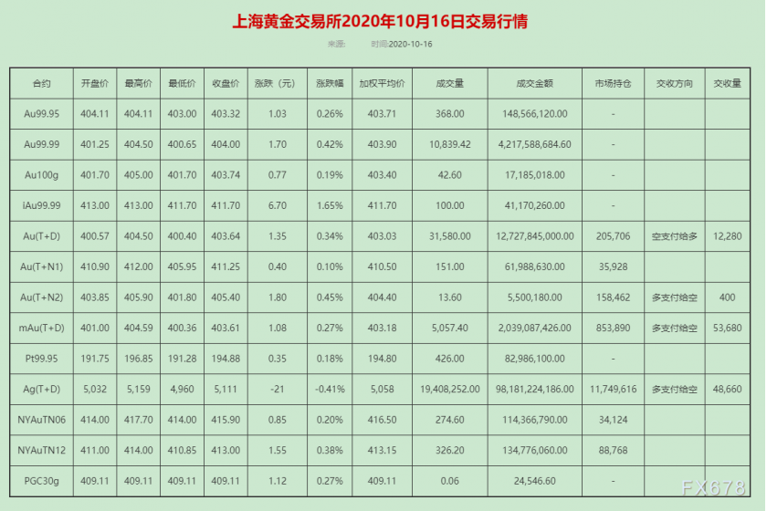 周五(10月16日)黄金T+D收盘上涨0.34%。现货黄金探底回升10美元至1910上方,日内一直运行在1900上方,美元指数涨势暂歇,全球货币政策依旧处于宽松格局状态,另外,欧美疫情进一步恶化,且美国就业市场停滞,这令黄金获得一定避险需求。随着欧洲疫情反扑,拉加德表示,欧洲央行将准备采取进一步紧急措施,以应对新冠