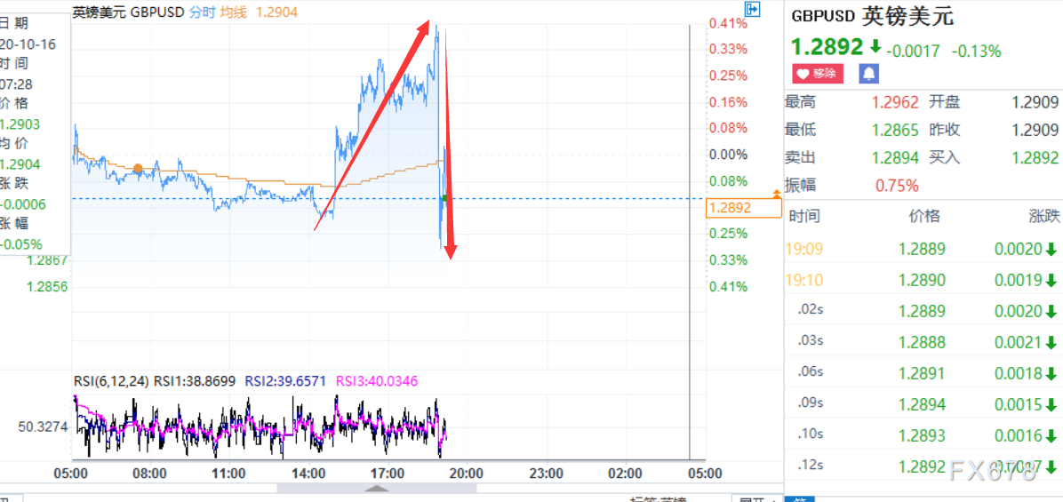 周五(10月16日)欧市盘中,英镑兑美元上演过山车行情,此前一度走升约80点至时段内高点1.2962,但随后短线跳水近百点至1.2864,因英国首相约翰逊称最新的欧盟峰会表明欧盟不接受加拿大式的协议,我们应该为明年1月的无协议式退出做好准备,此番言论导致市场对英国脱欧协商的乐观预期火速降温,此外欧美国家新冠疫情的