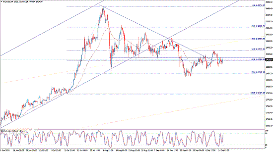 周五(10月16日)亚市早盘,现货黄金温和走低,金价现报1906美元/盎司附近。知名财经网站cooi.co最新撰文,对金价后市走势进行分析。 因美国总统特朗普再次点燃人们对在11月3日大选前通过新冠病毒刺激计划的希望,黄金价格周四小幅上涨。 现货黄金周四收报1907.58美元/盎司,上涨7.15美元或0.38%。特