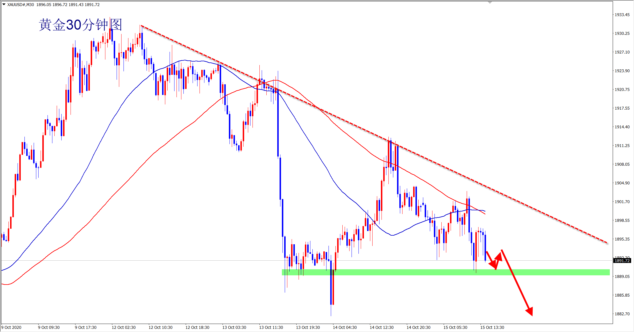 黄金欧盘1901现价空,如期跌至1890,收割一波,随后行情拉升,短线继续维持震荡,长时间的震荡只是再次选择方向前的准备,而现在明显的空头走势,加之今晚周初请数据公布,消息面刺激技术走势,必然是跌,美盘继续关注1902位置压力,此位置下继续空,破位只是时间问题! 黄金从1933位置下跌,昨日虽然强势拉升