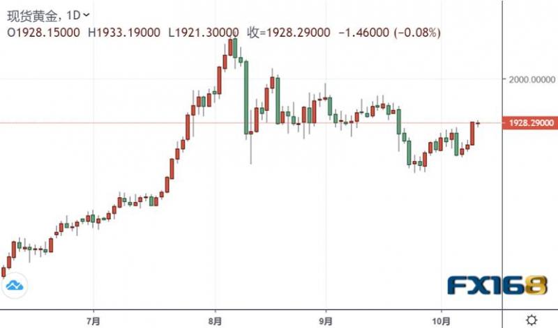 周一(10月12日)亚市盘中,现货黄金整体维持跌势,尽管日内一度触及1930关口,涨势很快回落,价格目前徘徊在1920附近。白银则保持在25美元上方。 美国周一是哥伦比亚日,债市休息,但股市如常。本周市场继续聚焦美国白宫与民主党就纾困方案的谈判。 周六,特朗普政府提出的一项1.8万亿美元的新经济