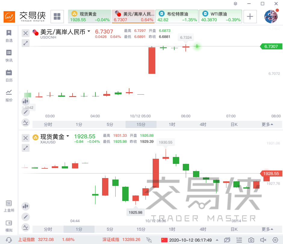 周一早上06:07,现货黄金短线走高,上破1930美元/盎司,为9月21日以来首次。离岸人民币兑美元跌近400个基点,最低跌至6.7270。 有分析认为,此波行情或与国庆后人民币的暴涨有关,或属于技术性修正。 10月9日,在岸人民币一度拉升超1000点,离岸人民币一度涨破6.70关口,刷新2019年4月以来高点,日内涨近