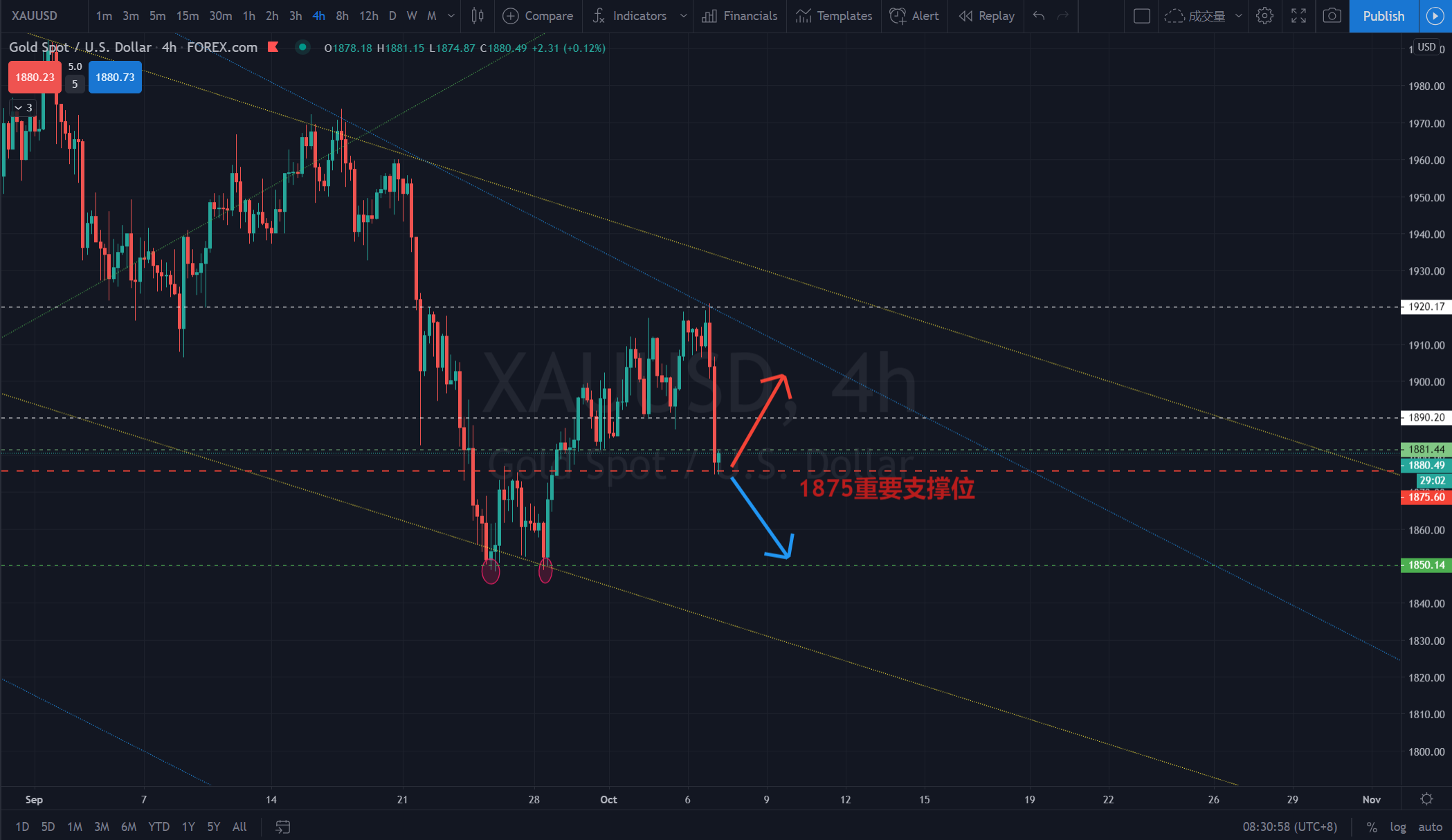 黄金周一在美国总统出院的消息推升下探底回升走高攀升1918.5区域。 周二美盘前延续反弹走高直至22点上探至1921区域,随后美国总统一句放弃经济援助计划直至大选结束,黄金美股全线下挫放量走低。 黄金承压回落走低,午夜时段下探至1898,反弹确定阻力1906继续放量走低至1874,今日周三早盘延续走低破低18
