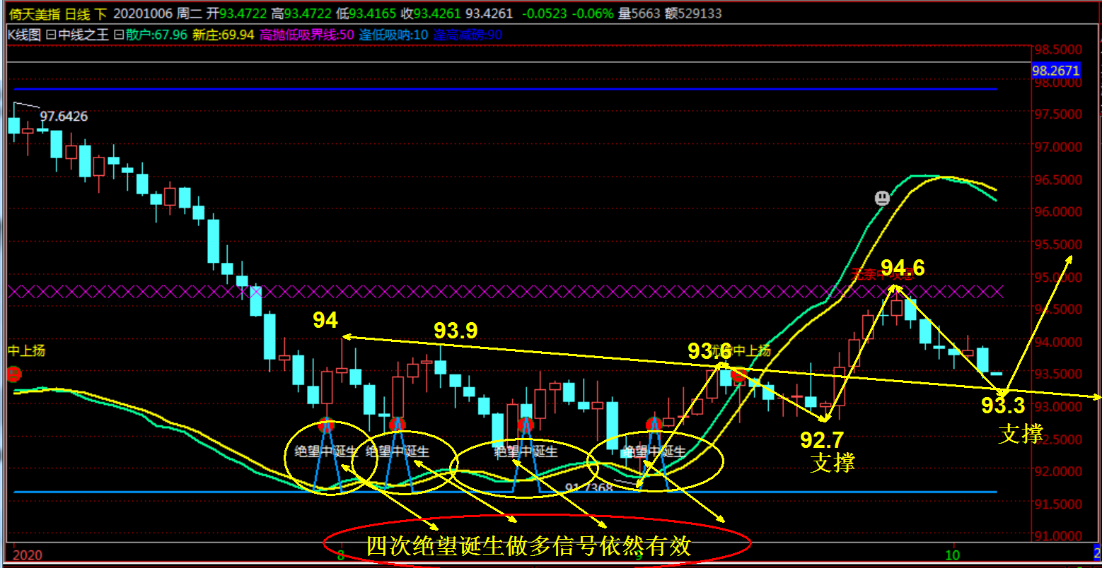 多余的话不说美元是落地凤凰不如鸡,低位震荡反复,早上特不靠谱虽然否决大的刺激法案,但是小的医疗刺激依然在,导致美元冲高回落,既然形态技术没有改变回落93.5到93.3区域继续做多不变。综合上述操作思路如如下; 压力:94.8-----95.6支撑:93.3--------92.7 回落93.6哒93.3区域买入93损即可,目标都