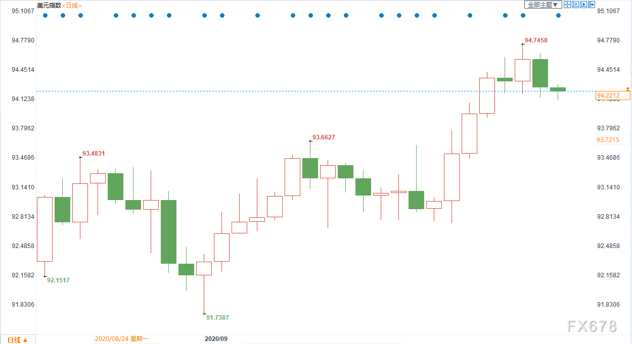 周二(9月29日)亚市盘初,美元指数延续跌势,一度创四日低点至94.11,隔夜美国股市延续大涨走势,打压了美元的避险需求,令美元承压,但94关口附近支撑较强,需要关注。现货黄金小幅冲高,最高曾触及1886.26美元/盎司,美元的走弱和对美国财政刺激的憧憬,吸引了投资者逢低买入黄金。原油市场,股市大涨也给油价提供了