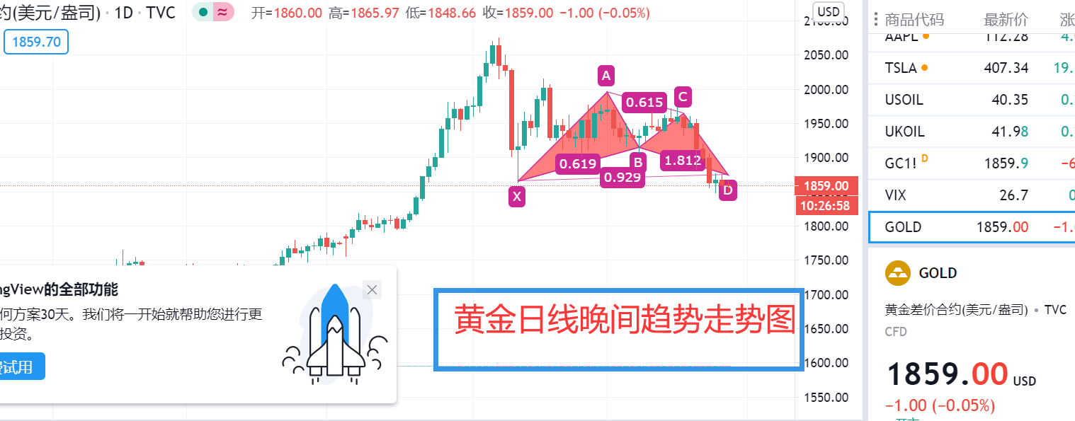 永远不要低估市场的力量,保持敬畏与机敏,各位好。 黄金今天白盘整体波动不大,欧盘期间再次向下测试1848关口,但仍然没有突破,随后黄金终于在欧盘后期时段开始有了点波动,连续四小时上拉26美金,最高打到1877美元,随后遇阻回调,这波连续的上涨不知道有没有沉不住气开始心慌?其实大可不必,还记得白天跟
