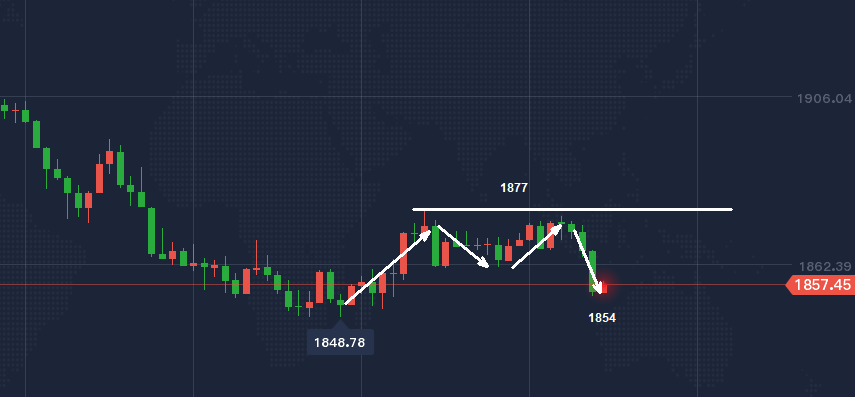 日内方面我们选择了观望,主要在于昨天晚间的探底回升打断了短线极弱的形态,另外早间二次测试凌晨回踩的低点反抽,做多做空都是五五开。 欧盘走势过后美盘做跟随交易会较为轻松,日内没有突破昨天高点1877一线,反而是向下承压回落跌破1861.5,这把短线行情再度拉入偏弱形态当中,所以美盘还有向下回撤的空间
