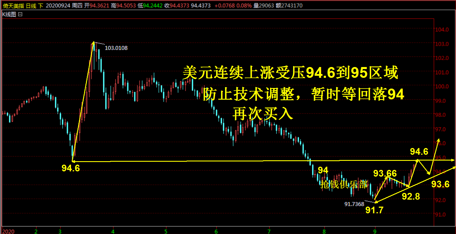 多余的话不说前期日线四次绝望诞生美元也是连续突破上涨,连续上涨四天以后都是不要在追,毕竟这个上行马上遇到压力区域94.6到95位置,前期94.6是调整低点起涨的位置,如今是顶底转换第一压力,其次95区域是2019年度95到97.7区域横盘下轨的支撑,如今成为压力区域。那这样就是可以轻松得到94.6到95区域在没有特比利好