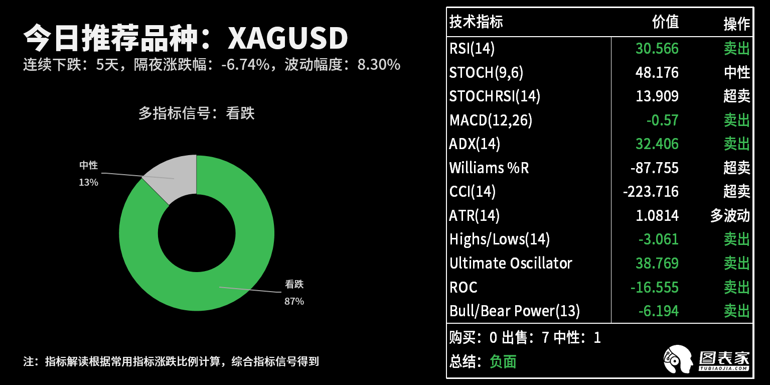 日内推荐交易品种及相关策略: 国际白银(下跌:5天,隔夜涨跌幅:-6.74%,波动幅度:8.30%)。 根据外汇相关性实时追踪,XAGUD在30分钟周期下与部分货币的相关性排行如下图: 其中,XAGUD和XAUUD在该周期下相关系数达到0.96,对投资者提出如下建议: 做多/空1标准手XAGUD的同时,