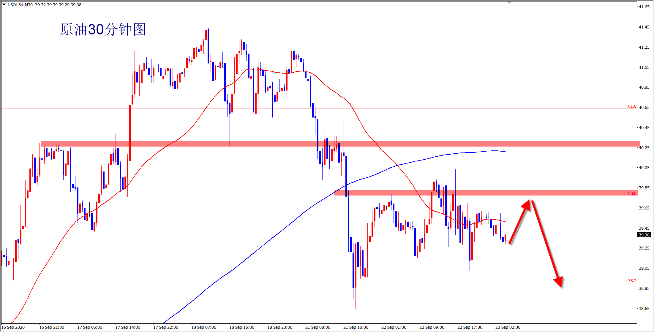 原油昨日依然是40.3压力位置下震荡走势,没有突破前依然偏空看跌,早盘反弹39.8附近后再次干空! 原油从43位置大跌后在36位置获得支撑反弹,最高反弹触及41.5区域,最终承压于1小时级别的均线压力后回落,并且直接跌破40.3支撑和39.6支撑,当前行情暂时维持在40.3压力位置下震荡,此位置也是30分钟走势图上长期
