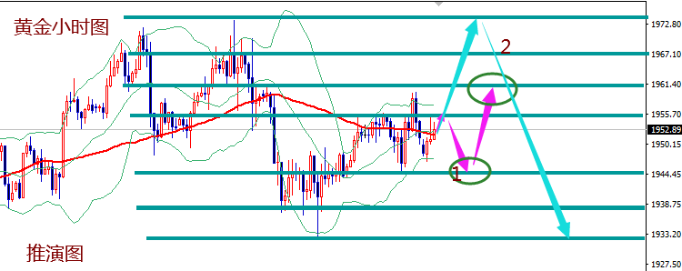 今日亚欧盘行情分析: 周评中给大家详细分析过目前的行情,目前行情属于三角破位后的回踩测试,测试完毕会直接拉升,所以操作上,主多副空。只要回踩不破上升三角整理,那么三角整理结构成立,后市看涨。 上方短线压力在1960周五反抽的高点位置,下方短线支撑在1945-46尾盘起涨点位置,同时1945-46是日线