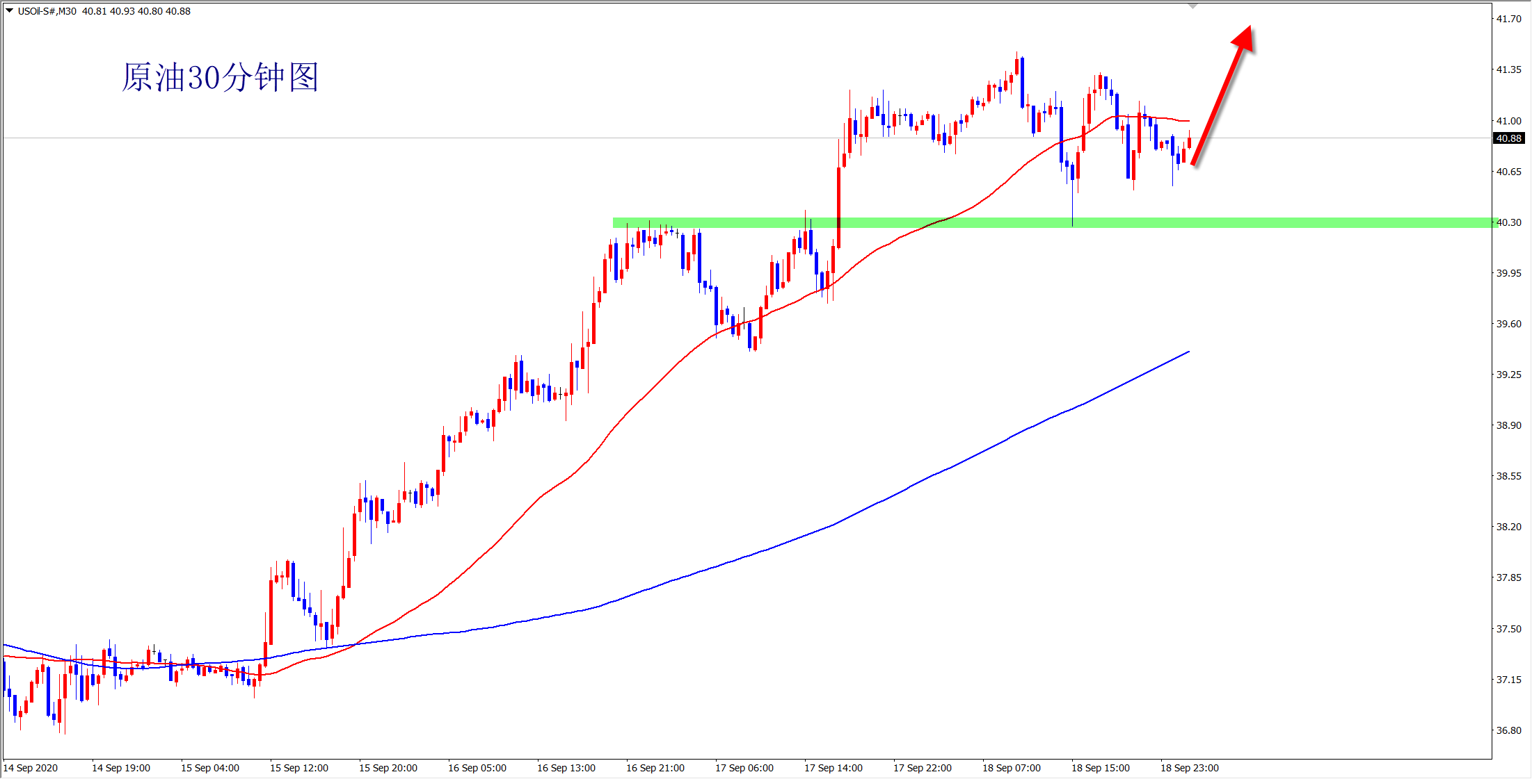 原油上周五提示回踩40.3支撑区域干多,原油早盘先涨,冲高回落40.3支撑后再次拉起,完全符合我的判断,今日原油还是继续干多不变,40.3附近多! 原油最近由于受到飓风的影响,产量受到影响,支撑油价反弹,当前的反弹也是涨至了4小时均线压力位置区域,所以行情开启震荡,但是从30分钟走势图上可以看出,原油依