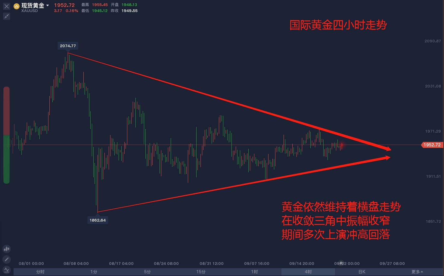 9.21黄金分析策略: 上周黄金围绕在1950上下震荡多日,周线最终收得一带有上影线的小阳星线,收于5、10周均线附近,如此形态并不能给未来波段级别走势指引方向,反倒增加不确定风险。 日线结构上,黄金上周基本是围绕1950上下运行的,处于均线带内运行,也处在预期的三角区间内运行,三角上沿压力虽有测