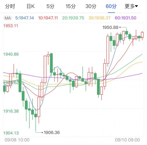 周四(9月10日)亚市盘中,现货黄金早盘冲高逼近1950后再度回落,昨日黄金价格上涨,连续第二个交易日上涨,因欧元走强打压美元,提振了以美元计价的黄金的吸引力,从而获得支撑。现货黄金一度上破1950美元/盎司,刷新日高至1950.79美元/盎司,较日低拉升30美元。 RJOFutur资深市场策略师oHarkor