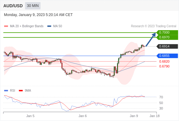 周一(1月9日)盘中,澳元/美元暂报0.6935,涨0.0059,涨幅0.86%。 澳元/美元汇率今日分析:在0.6855之上,看涨,目标价位为0.6970,然后为0.7000。在0.6855下,看空,目标价位定在0.6820,然后为0.6790。 技术点评:RI技术指标呈现进一步上升趋势。 阻力位:0.685