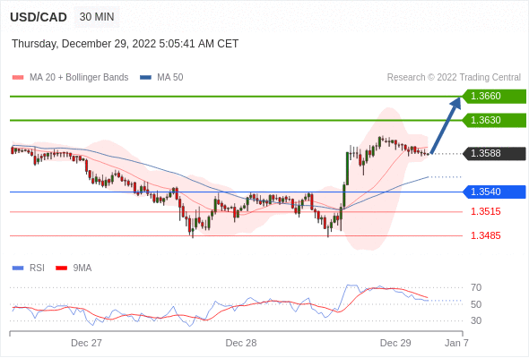 周四(12月29日)盘中,美元/加元暂报1.3585,跌0.0016,跌幅0.12%。 美元/加元汇率今日分析:在1.3540之上,看涨,目标价位为1.3630,然后为1.3660。在1.3540下,看空,目标价位定在1.3515,然后为1.3485。 技术点评:在1.3540之上,为多头信号,向上的目标位为1.3630。