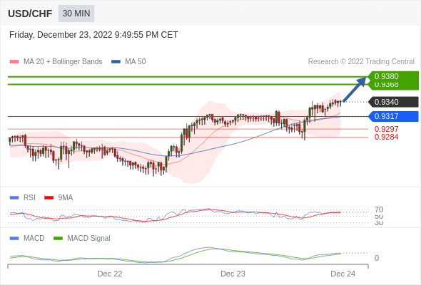周一(12月26日)盘中,美元/瑞郎暂报0.9324,跌0.0006,跌幅0.06%。 美元/瑞郎汇率今日分析:看涨,当0.9317为支撑位。向下跌破0.9317,将带来继续下跌的趋势,目标位为0.9297然后为0.9284。 技术点评:RI技术指标超过50。ACD技术指标呈现看多状态并处在其信号线的上方。此外,价位处