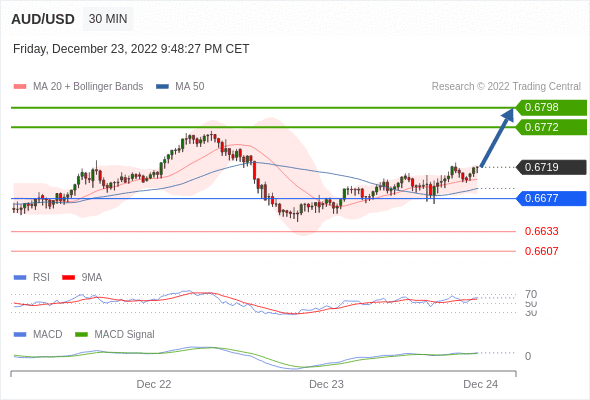 周一(12月26日)盘中,澳元/美元暂报0.6714,涨0.0001,涨幅0.01%。 澳元/美元汇率今日分析:看涨,当0.6677为支撑位。向下跌破0.6677,将带来继续下跌的趋势,目标位为0.6633然后为0.6607。 技术点评:RI技术指标大于中性区域50。ACD技术指标处在其信号线之上看多。此外,价位高于
