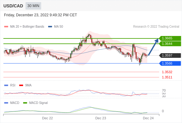 周一(12月26日)盘中,美元/加元暂报1.3597,跌0.0006,跌幅0.04%。 美元/加元汇率今日分析:有上涨的可能,目标价位定在1.3665。如跌破1.3566,UD/CAD目标方向定在1.3532和1.3511。 技术点评:RI技术指标低于50。ACD技术指标呈现看跌状态并处在其信号线的上方。此外,价位低于其20