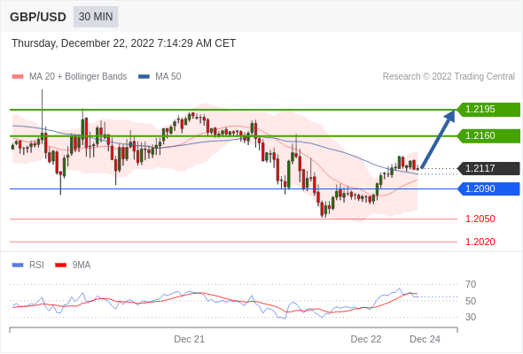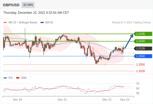 周四(12月22日)盘中,英镑/美元暂报1.2128,涨0.0045,涨幅0.37%。 英镑/美元汇率今日分析:在1.2090之上,看涨,目标价位为1.2160,然后为1.2195。在1.2090下,看空,目标价位定在1.2050,然后为1.2020。 技术点评:在1.2090之上,为多头信号,向上的目标位为1.2160。