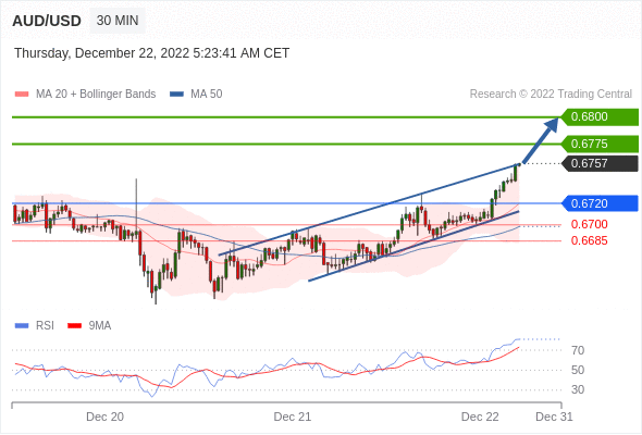 周四(12月22日)盘中,澳元/美元暂报0.6756,涨0.0049,跌幅0.73%。 澳元/美元汇率今日分析:在0.6720之上,看涨,目标价位为0.6775,然后为0.6800。在0.6720下,看空,目标价位定在0.6700,然后为0.6685。 技术点评:RI技术指标看涨,有进一步向上趋势。 阻力位:0.