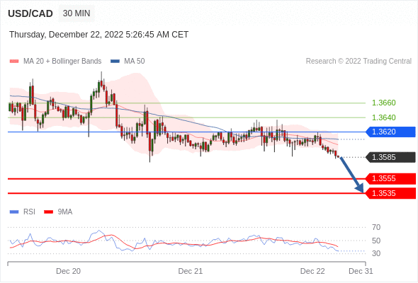 周四(12月22日)盘中,美元/加元暂报1.3585,跌0.0025,跌幅0.18%。 美元/加元汇率今日分析:在1.3620之下,看跌,目标价位为1.3555,然后为1.3535。在1.3620上,看涨,目标价位定在1.3640,然后为1.3660。 技术点评:RI技术指标上,呈现新的下降趋势。 阻力位:1.35