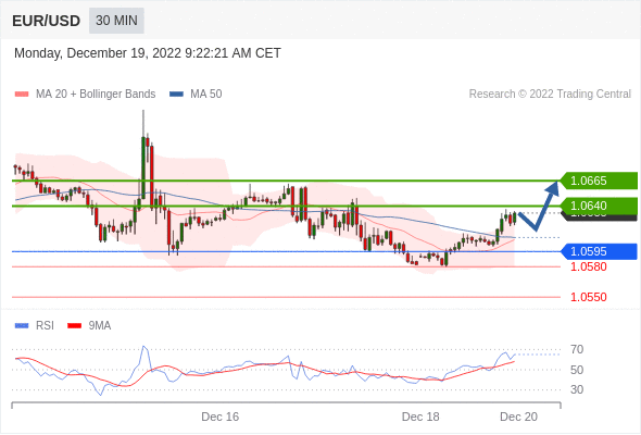 周一(12月19日)盘中,欧元/美元暂报1.0636,涨0.0047,涨幅0.44%。 欧元/美元汇率今日分析:在1.0595之上,看涨,目标价位为1.0640,然后为1.0665。在1.0595下,看空,目标价位定在1.0580,然后为1.0550。 技术点评:RI技术指标向上运行。 阻力位:1.05951.05801.05