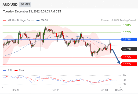 周一(12月13日)盘中,澳元/美元暂报0.6773,跌0.0003,跌幅0.04%。 澳元/美元汇率今日分析:在0.6775之下,看跌,目标价位为0.6725,然后为0.6705。 技术点评:只要0.6775阻力位不被突破,向下跌破0.6725位置的风险很高。 阻力位:0.67250.67050.6685