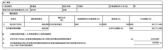 腾讯控股7月9日晚间在港交所公告,7月8日回购86万股,回购价格为349港元-352港元,耗资约3.02亿港元。自6月27日腾讯主要股东ar宣布将减持腾讯股份以来,腾讯控股累计回购681万股,耗资约24亿港元。