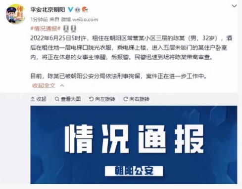 2022年6月25日5点10分左右,租住在北京朝阳区常营某小区三层的陈霄华,酒后在租住地一层电梯口脱光衣服,乘电梯上楼,闯入五层未锁门的某住户卧室内,将正在休息的女事主惊醒,女生拿起床上的筋膜按摩滚动抽进行自卫,但陈霄华有进一步侵犯的意图,女生只好喊醒隔壁的室友,最终室友帮其报警。