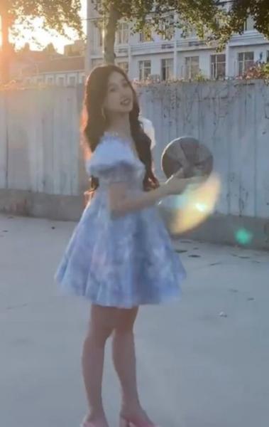 近日,虞书欣在社交平台上发布了一段她穿高跟鞋打篮球的视频。视频中的虞书欣一头红棕色的及腰长发,身穿水蓝色短裙,露出胸前事业线,非常美丽,吸人眼球。她笑靥如花,甜美可爱,让人移不开视线。 穿着一双粉红色的高跟鞋,本来只是在拍照的虞书欣,突然拿起手上的篮球开始拍打了起来,她穿着高跟鞋一
