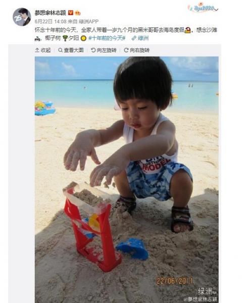 22日,林志颖晒出十年前与kii在海岛度假的旧照,当时的kii还只有一岁九个月,林志颖还调侃儿子叫“黑米哥哥”。