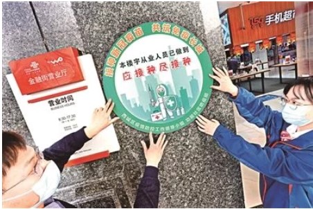 3月10日上午,位于北京市西城区金融街的中国联通大厦的外立面处多了一张新标识。原来,这是为接种疫苗优先达标的商务楼宇颁发的新“身份”。据了解,这张绿色的标识证明该楼宇疫苗接种人数超过80%,而联通大厦也成为西城477个商务楼宇中第一个张贴该标识的。下一步,西城将逐一对达标楼宇进行贴标。