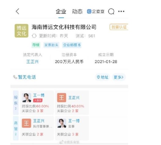 据企查查,海南博远文化科技有限公司于1月28日成立,所属行业为娱乐业。王一博持有该公司60%股份,认缴出资额为120万元,为该公司最大股东、实际控制人、最终受益人。