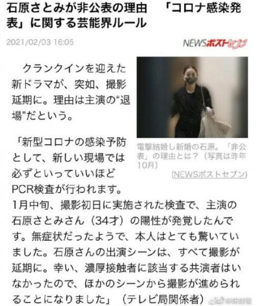 据日本媒体Wotv消息,日本演员石原里美核酸检测结果呈阳性。据报道,为防范新冠疫情,剧组在开机前要进行核酸检查,在1月中旬,拍摄日第一天的核酸检查中,主演石原里美被查出核酸阳性。据悉,石原本人并没有症状,本人对检测结果也感到惊讶。石原出演的戏份也因此全部推迟拍摄。据电视台相关人士透露,幸运