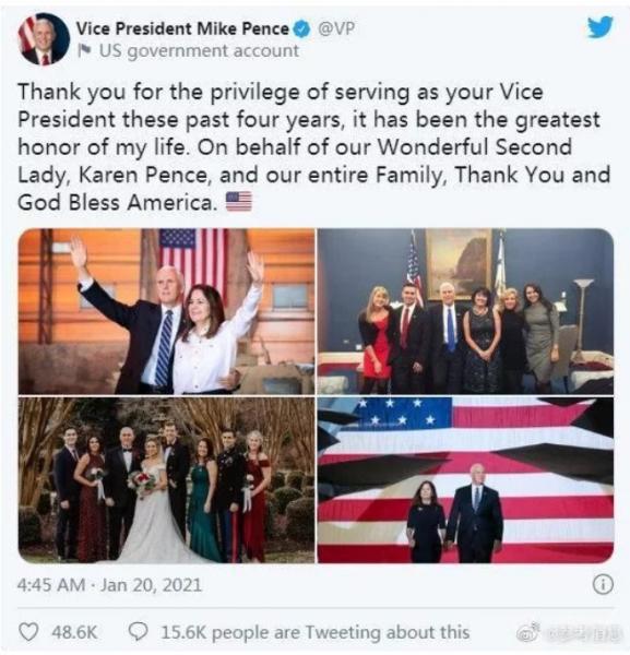 彭斯于当地时间19日发推称:“感谢你们在过去的四年里让我担任你们的副总统,这是我一生中最大的荣誉。我代表我们的第二夫人卡伦·彭斯和我们整个家庭感谢你们。愿上帝保佑美国。”英国《独立报》网站报道称,彭斯在他的推特告别信息中发布了四张照片,其中没有一张特朗普的照片。