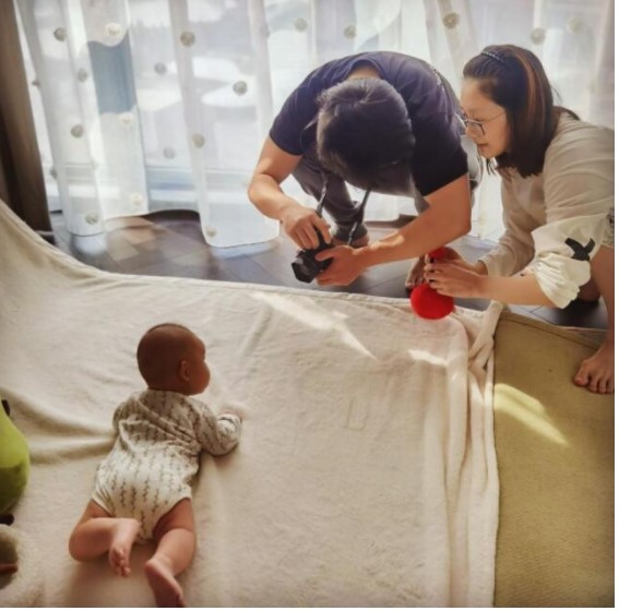 18日,郑恺在社交平台上晒出一家三口的合照为女儿庆祝满百天,这也是郑恺首次晒出女儿的全身照。照片中,郑恺手里拿着相机,蹲地给女儿拍照,而苗苗负责逗宝宝,手里拿着红色玩具吸引女儿的注意力。