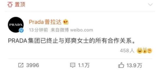 1月19日,知名奢侈品品牌普拉达在社交平台发文宣布终止与郑爽女士的所有合作关系。
